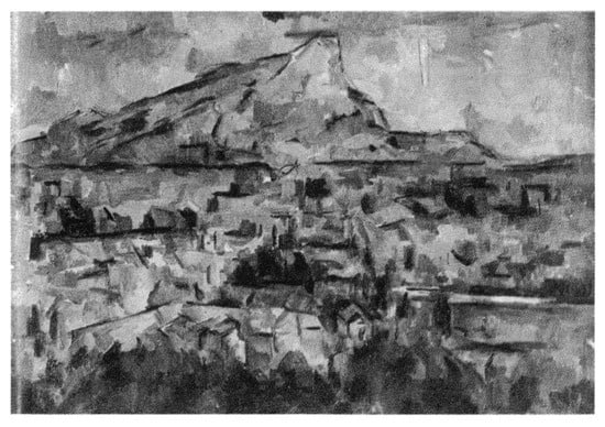 Merleau-Ponty repeatedly used words such as “ambiguity” [27,28] or “obscurity”, and “depth”. Merleau-Ponty mentioned that all experience is ambiguous. These words represent a situation in which reversibility (material/immaterial, visible/invisible, and internal/external) is intertwined in space. Merleau-Ponty’s understanding derives from this chiasm, especially from the relationship between visible and invisible. Rowe and Slutzky also stand at the same point with the phenomenal/literal transparency he tried to solve concerning architectural visible/invisible. Further, they investigated Cézanne’s “Mont Sainte-Victoire” (Figure 4) [2,23].