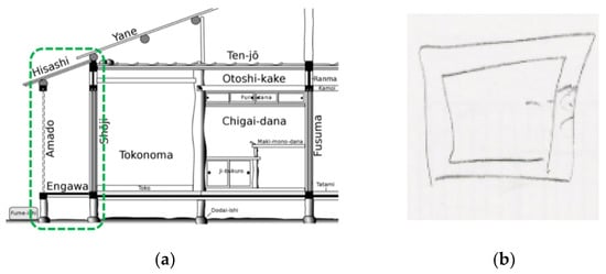 (a) Engawa cross-section (green line) through part of an Edo-era Japanese house (source: Wikimedia Commons); (b) SANAA’s conceptual drawing of a cloister (source: Copyright Adapted with permission, 2005, El Croquis,) p. 9).