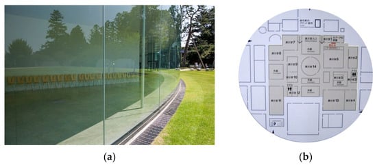 The architecture of the Contemporary Art Museum in Kanazawa has a clear boundary between inside and outside in glass (see Figure 6a). The boundary with the outside is composed of a transparent glass wall that integrates and surrounds the combined rooms. The space surrounding the central exhibition space, which is viewed as a public space, acts as a buffer zone (see Figure 6b). In this work, the corridor that creates the secondary boundary serves to create visual perception of the relationship between the opaque rooms.