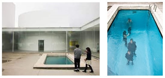 The works exhibited in this museum also establish active visual relationships and passive observations through the various connections of visual perception between the viewer and the exhibited object. For example, Tadao Ando’s Chichu Art Museum in Naoshima has works similar to the outdoor sculpture “Sky Blue Planet” by James Turrell. The spectators who make up the sky witness the ever-changing spectacle of the sky and environment [39]. Another work, Leandro Erlich’s “Swimming Pool”, shows the depth of phenomenological transparency. Two acrylic plates were placed about 12 inches apart in the basement, and a layer of water about 4 inches thick was also placed on top of the acrylic for a realistic effect. Thus, there appears to be a swimming pool in the middle of the museum, and it is impressive to see people in the water (in the underground exhibition hall) from outside the pool. When one enters the underground exhibition hall, one can see people above through the water [40]. The spatial depth of the exhibition hall is newly recognized through the medium of virtual water depth (Figure 7).