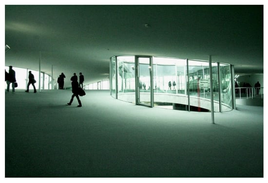 The Rolex Learning Center is located in the Ecole Polytechnique Fédérale de Lausanne (EPFL)campus. The EPFL held an international competition to select architects for building this Center. The EPFL has formulated very ambitious program requirements to guide the future of learning. The architectural program aspect demands far more than functional requirements. Buildings need to “endow themselves into the environment as a sign of the landscape”, are “magnified”, “should be important”, and “should be a beehive of activity” [41]. As an architectural device for this activity, the flowing landscape, the building provides a view unobstructed by walls, with a disturbing visual perception of the interior and courtyard. The greatest strength of the building lies in the continuous floor plan. The experience of bending through space differs from that in other spaces. It is an experience that challenges traditional movement concepts with artificial structures, such as strictly vertical or horizontal ones [43,44] (see Figure 8).