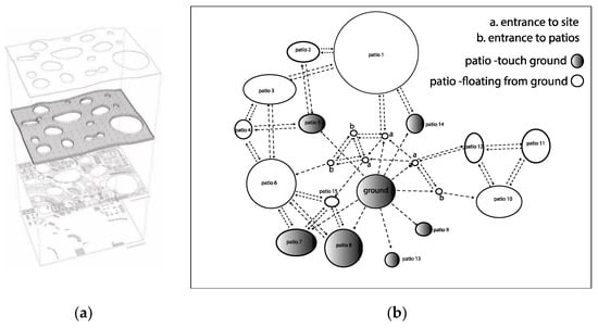 Figure 9a shows a plane representing the site level and the ground floor. This drawing reveals the depth of space between the ground level and the patio. The diagram in Figure 9b shows the link between space and visual connections. Through the complexity between the material (glass) and the immaterial (sense of patio’s depth), people can perceive the experiential depth in space.