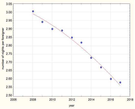Development of the number of nights spent in collective accommodation establishments in the Czech Republic by non-residents in 2008–2017 (nights/foreign tourist) [33].