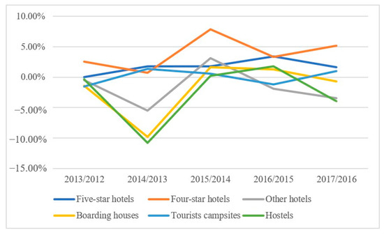 The development of the tourist accommodation sector contributes significantly to the overall growth of tourism. The need for accurately predicting the demand for tourist accommodation for international and domestic tourists is a key goal for future good preparation and appropriate strategy [8]. The empirical results confirmed that overnight stays for foreign tourists were positively associated with the prices of short-stay accommodation. Tourists could benefit either from greater price stability or from differentiated seasonal prices, which are important in the promotion of the price attractiveness of the tourist destination [9]. The findings also reveal that the local tourist accommodation supply has experienced an especially dynamic, sustained growth over the past decade. This expansion has been accompanied by an increased supply of other services, suggesting that accommodation can positively influence the existing and/or future socio-economic development of low-density territories [10]. Accurate forecasting of hotel accommodation demands is extremely critical to the sustainable development of tourism-related industries [11].