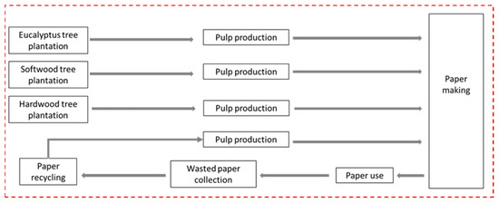 Data on the production process for pulps were obtained from Ecoinvent v3.0. It was assumed that the whole wood produced was used exclusively for paper production.