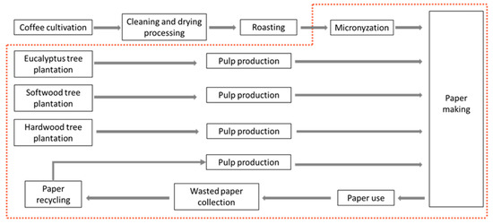 The study retrieved most of the data for the main processes from Ecoinvent v3.0 [27], including the production of pulps, paper, alkyl ketene dimer, brighteners, potato starch, pesticide, glyphosate, coffee cultivation, eucalyptus plantation, paper recycling, etc. This data was then inserted into the GaBi database [28]. However, several background-based processes and flows that are available in Ecoinvent v3.0 are not present in the database (e.g., sulphur dioxide production, sodium sulphate production, etc.), and, as a result, were not included. When possible, proxy processes were used.