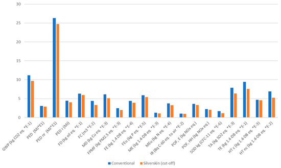 Comparison of the environmental impacts of the two investigated productions of paper—conventional (in blue) and with the addition of silverskin (in orange). Please note that the abbreviations present in this figure, are explained within Table 3 above.