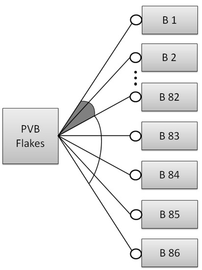 Two or more polymers were prepared by mixing with non-polymeric additives (e.g., fillers, plasticizers, etc.). By adding polymers to the basic component of PVB, various variations in the final products were created (Figure 3 and Figure 4)—substances that differ in their properties and use. To optimize the mixing of properties, we applied a feature model diagram (FMD) with a tree structure, the root (PVB) of which represents the concept, and the nodes describe the properties. The relationship between a parent property and a child property generally indicates that the child property requires the inclusion of a parent property. In general, we distinguish three basic types of properties [22]: