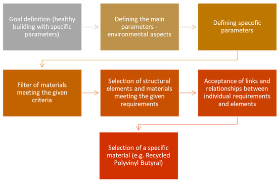 The proposed knowledge database will contain multiple tracked and desired parameters. The basic concept is that each item (structural element or material) contains the information. Clearly, they must also be defined, and relationships between them must only pertain if the building and health benefits are intelligent. As part of this process, in the following, the selection of the structural material (also examined in the form of the recycled polyvinyl butyral) is described by the specified parameters and a knowledge system comprising this information and bonds (Figure 6).