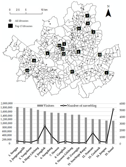 The National Library Statistics System (NLSS, https://www.libsta.go.kr (accessed on 1 June 2021)), which is operated by the Ministry of Culture, Sports and Tourism (MCST), provides official statistics on the public libraries in each region annually. The area for this study was the public library of the Seoul Metropolitan Government. In order to create an attraction index by measuring the image and preference factors of the library on social media, libraries with relatively high exposure on the web were selected for this study. To this end, rather than examining the entire library system, the top 15 libraries (of the 147 libraries in total) based on the number of visitors provided by the NLSS were selected and studied. One reason for this decision is that, for libraries with few visitors, it is challenging to extract an attraction index from user-generated content, because there is little exposure on the web.