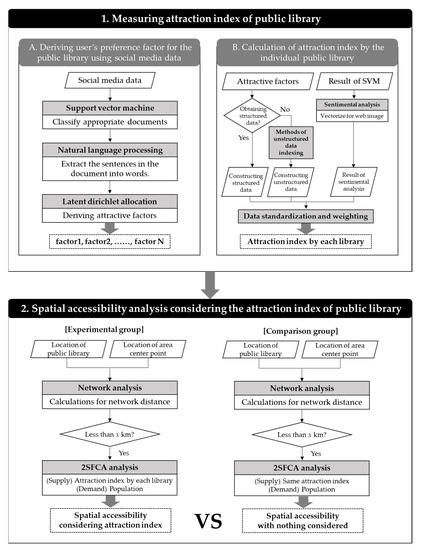 The second step was to measure the spatial accessibility of the entire city by applying the 2SFCA model, which provided the calculated attraction index as a supply factor for individual libraries. In this case, a comparison group was constructed with the same supply factor in order to compare the ways in which spatial accessibility differs with the attraction index’s application. The overall flow chart is depicted in Figure 2.
