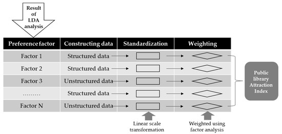 In order to calculate the library attraction index, the indicators that reflect the user preference factors derived in the previous section should first be established. To begin, an index is designed to make it easier to see how certain figures, such as quantity and price, have changed over time, as opposed to looking solely at the specific number itself. By contrast, an indicator represents statistical figures for specific data. Therefore, in creating the index, it is necessary to establish the individual indicators of the derived library preference factors and combine them. At this time, if there are specific structured data, such as statistics, that can indicate the factors, then for each preference factor the data should be established as an indicator. However, if there are no structured data, then the unstructured data should be used to build the indicator. In this study, the statistical data provided by the NLSS were limited to structured data. Figure 3 illustrates the process used to create a public library attraction index by constructing the indicators for each preference factor. First, the indicators are established for each library-use preference factor derived from the LDA results, then the final attraction index is calculated by standardizing and weighting them. The next section will discuss how to build indicators using unstructured data.