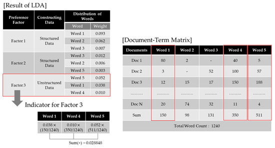 As shown in Figure 4, factor 3 has no associated structured data, so it is necessary to build the indicators from unstructured data. This study considered the weights for keywords obtained by means of LDA results and the frequency of word references built by means of a Document Term Matrix (DTM). For example, factor 3 was the topic of “childcare”, and word 5, word 1 and word 4 extracted as the main words for this topic are “nursing room”, “children” and “stroller”, respectively. To begin with, each library-specific DTM was created for the social media data collected, and then the number of mentions per word was counted. Then, these were combined with the LDA result value, i.e., the word weight. The LDA presents the topics for the whole article as well as the words and word weights that make up the topic. The results showed that, on the topic of “childcare”, “nursing room” has an influence of 0.052, “children” has an influence of 0.038, and “stroller” has an influence of 0.010. The use of unstructured data to establish the indicators of preference factors is shown in Equation (2).