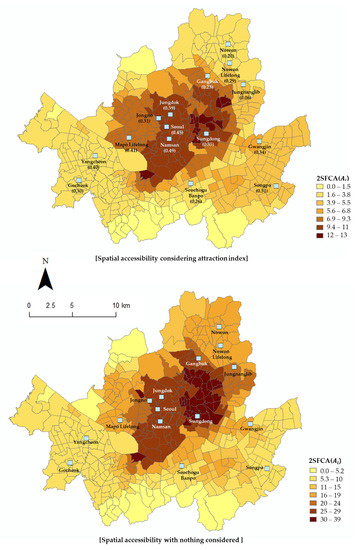 This study set the spatial analysis unit to the administrative boundary, Eup, Myeon and Dong, and used the road network distance from the central point of each Eup, Myeon and Dong to the public library. The critical distance was set at 10 km, which is generally considered to be about 20 min by car. In fact, when building a public library, there is a rule that it must be accessible within 20 min (2 km) on foot in urban areas, but that rule may change when public transportation is available [48]. In addition, because the hypothesis of this study is that improving the quality of public libraries is more important than increasing the number of public libraries and also improves the sustainability of welfare facilities in the city, this study considered the distance reachable by car. If a public library with a high attractiveness index is located within 20 min by car, then it is presumed that users are willing to visit, even if not on foot. The distance was calculated between the supply and demand sites from the central point of each Eup, Myeon and Dong to the public library by using the OD cost matrix, one of the network analysis methods in ArcGIS 10.3; only those within 10 km were selected and analyzed. At this time, the quantity of demand was applied to the population in each Eup, Myeon and Dong. For the supply amount , the public library attractiveness index calculated in the previous section was applied to the experimental group, and 1 was applied to the attractiveness index in the comparison group.