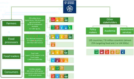 The objective of this paper was to provide an overview of the main primary and secondary stakeholders in the food supply chain and how they are related with the UN SDGs. More specifically, we connected UN SDG targets with primary stakeholders (Section 2), and further deployed impacts of farmers, food processors, food traders and food consumers on achieving UN SDGs (Section 3). Section 4 provides an insight on how policymakers and governments, inspection services and certification bodies, the scientific community and other secondary stakeholders affect UN SDGs from a food perspective. Finally, we graphically depicted the food supply chain in terms of main facts and figures and UN sustainable development goals.