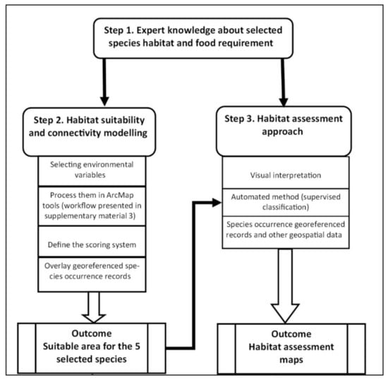 The outcomes of the Step 2 (habitat suitability and connectivity) and Step 3 (habitat assessment via visual interpretation and supervised classification methods) for the five species are presented in this section. The information from Step 1, expert knowledge elicitation (complemented with appropriate records), is not presented because it is embedded as underpinning knowledge for the other two steps (see Table S2 [,,,,,,,,] and Table S3 [,,]).