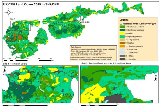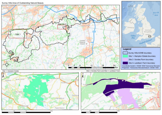 The Surrey Hills was one of the first landscapes in the UK to be ‘designated’ as an ‘Area of Outstanding Natural Beauty’ (AONB) in 1958. It should be noted here that AONB is not a subjective term of the authors but a formal one created by the UK Government. In June 2000, it was confirmed that AONBs have the same level of landscape quality and share the same level of protection as National Parks, and the primary purpose of an AONB is stated as ‘to conserve and enhance the natural beauty of the area’. There are 34 AONBs in England, and together they cover 15% of the total land area. Notably, AONBs and National Parks are found in Category V—landscapes managed mainly for conservation and recreation—of the International Union for the Conservation of Nature and Natural Resources’ global network of protected landscapes [].