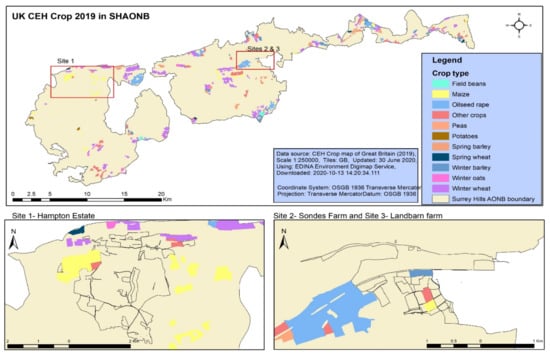 The SH-AONB is covered by 11 of the CEH LC classes illustrated and listed in Figure 3 for the whole SH-AONB and for our three intensive study sites. Further details of the SH-AONB LC and UK BAP Broad Habitats classes are given in Supplementary Materials (Table S1) [,]. UK CEH Crops 2019 product was obtained using Sentinel-2. The crops from 2019 in SH-AONB were identified as winter wheat, winter oats, spring wheat, winter barley, spring barley, oilseed rape, field beans, potatoes, maize, peas, and other crops (which might include other cereals, root crops, early potatoes, and vegetables) (Figure 4).