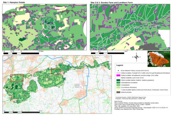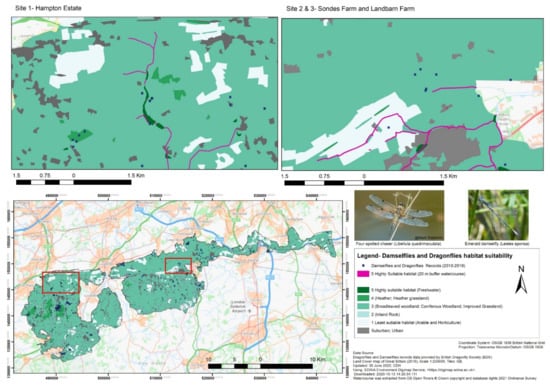 We extracted the watercourses from OS Open Rivers dataset provided by DigiMap Edina [] and small roads such as footpaths and bridleways from Open Street Map [], which has been used mainly for assessing the habitat suitability for dragonflies and damselflies and the silver-washed fritillary butterfly.