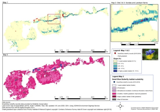 Figure 6 presents the suitable habitats for the SB butterfly, based on two environment variables: slope degree (Maps 1 and 2) and land-cover classes (Map 3). In addition, it overlays the records of SB butterfly from 2015 to 2019 which can indirectly confirm the presence of the Kidney Vetch plant (as this is only source of food for the caterpillars). It can be observed in both approaches (Maps 1 and Map 3) that most of the SB butterfly occurrence has been recorded across areas of chalk grassland (with a high slope degree), heather, and improved grassland.