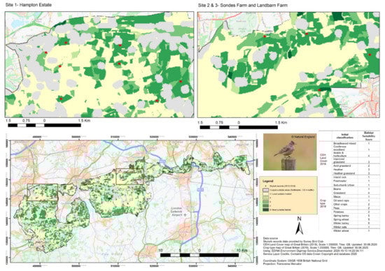The ecological information on the basic needs of these species for food, habitat type, dispersal movement, and breeding (Table S3 [,,]) was integrated with variables such as land cover, crop type, footpaths, topographical parameters, watercourses, settlements, etc., that could be observed in sufficient detail from the EO. These EO-observable variables played an equal role in evaluating the habitat suitability and its connectivity for the studied species. This habitat suitability evaluation process was applied both at the level of the three intensive study sites and also at the whole SH-AONB area level.