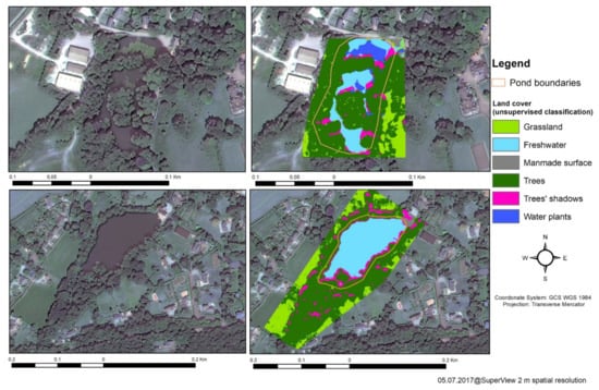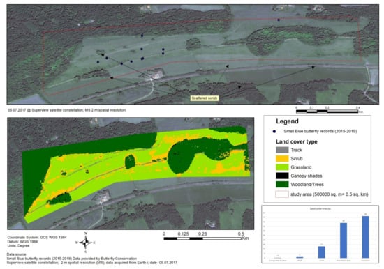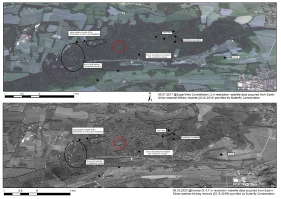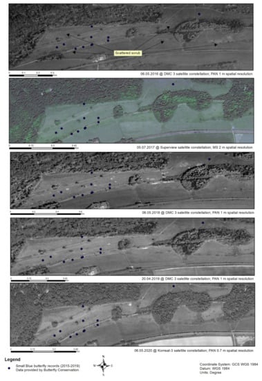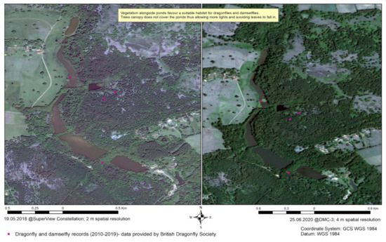Spatial resolution is an important attribute for the remote assessment of opportunities for biodiversity as it describes the level of spatial detail which can be seen in the image. Generally, higher spatial detail requires a sensor with a narrower field of view, hence less spatial coverage per image scene. Satellite sensors with a smaller field of view (e.g., Worldview and Superview have a 16 km swath) are generally constrained by low revisit times, unless the satellite is combined with phased orbit of the satellite constellation, which can offer a two day revisit for any point on Earth. Coarser spatial resolution sensors can image larger areas (e.g., Sentinel-2 can image strips 290 km wide) in one overpass of the satellite sensor with more regular repeat cycles []. There are also several important biodiversity trade-offs when considering the spatial resolution of a satellite sensor. For example, low-resolution data are perfectly adequate for monitoring status of broad land cover (LC)/use (LU) [] and land change at regional level [], while higher-resolution data are often desirable for monitoring at a local scale, individual protected areas [,] and agricultural practices [], habitat loss, fragmentation and degradation, and ecosystem services [,] and for substituting for physical inspection [,]. Moreover, Mairota et al. [] demonstrated that VHR satellite data can help mapping biodiversity and modelling habitat across different scales (landscape, plot, and patch) which can be used for identifying specific taxonomic groups. One other benefit of using VHR satellite data (0.5–5 m, depending on the optical sensor) is to discriminate some aspects of the habitat characteristics which normally cannot be seen at the coarser resolution []. For instance, case studies have been carried out using VHR optical satellite or aerial imagery for the mapping and monitoring of moorland to map vegetation patterns, evidence of ditching, and degree of peat exposure or burn histories [,].