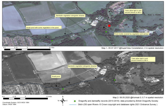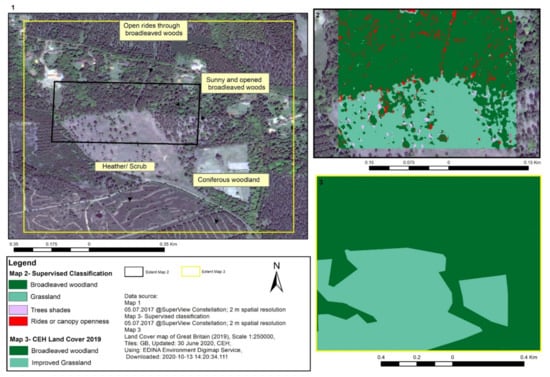 The Centre for Ecology and Hydrology (CEH) has developed its Land Cover Map spatial framework, which uses satellite data from 2015–2019 from the European Space Agency’s Copernicus Sentinel-1 and Sentinel-2 satellites. These have a high resolution (10 m) enabling the distinction between 21 land-cover classes on the basis of Sentinel imagery and linked to Biodiversity Action Plan (BAP) Broad Habitats []. However, it has been noted [] that discrepancies can exist in the habitat terminology, revealing the need for additional ecological expert knowledge and potentially VHR data to help resolve such ambiguities (e.g., in plant height estimations). VHR data have a wide application across many sectors, including assessing biodiversity and habitat quality []. While UK CEH LC and Crops are products that have a dynamic role for identifying main habitats, land cover/use and change and connectivity, and to support land parcel boundary mapping and principal crop types, VHR imagery can capture field boundary features (e.g., hedgerows and field margins), seasonal aspects related to agricultural management practices, vegetation patterns, evidence of ditches, forest canopy, etc. [,,].