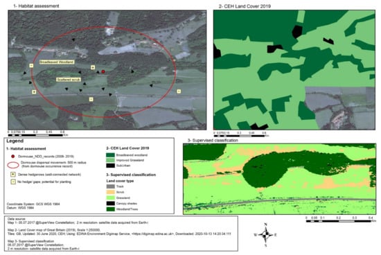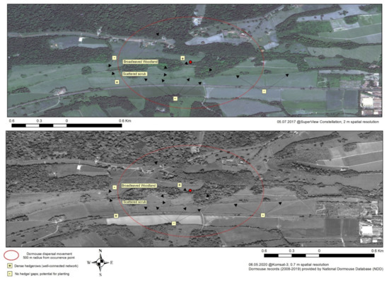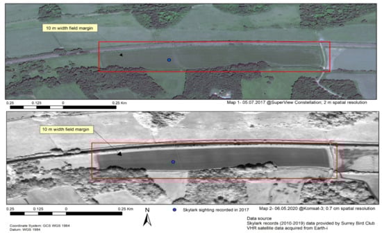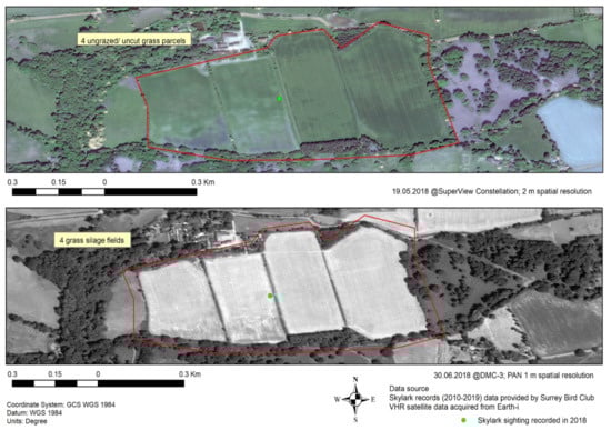 The advantage of very high spatial resolution (between 0.7–4 m in this study) was to unlock rich information for the species by distinguishing pattern, shape, texture, shadows, and colours (see Figure S1) and to reveal observable detail about the habitat(s) such as field boundary characteristics (e.g., hedgerows and field margins), agricultural management practices, ditches, woodland canopy structure, type of woodlands, continuity of the habitat over time, the interconnectedness of different types of habitats, etc. Patterns, shapes, texture, shadows, and colours were discriminated in “true colour” bands and translated into key features (see Table S5 [] and Figure S1).