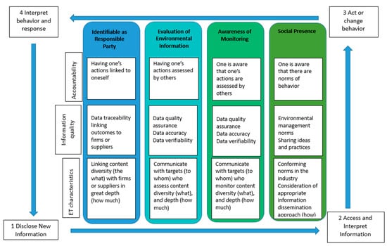 From the perspective of the stakeholders [20], ET should allow stakeholders such as customers, government, green groups, and non-government organizations (NGOs) to be more informed, which subsequently enables them to evaluate the extent of the transparency and accountability of a firm. Information provided by ET should allow the government to identify regulation needs and their effectiveness in improving the functioning of markets [21]. The information integration theory explains that each type of information has its own value (informational stimulus that affects judgment) and weight (the psychological importance of the information) [9]. When stakeholders perceive the new information is valuable (e.g., stimulates effective evaluation) and important (weight), they will be more likely to perceive the disclosure as being accountable through transparency (attitude change).