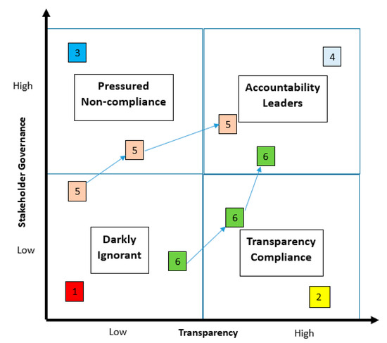 Figure 2 shows that some firms shift to a different category in the 2 × 2 matrix. As mentioned, many firms such as Nestlé experienced an unexpected crisis and were subsequently pressured by external stakeholders (usually NGOs or regulators) to rectify the damage. So, they followed the path with the number 5 in pink boxes in Figure 2, and were initially “Darkly Ignorant” but then shifted to a firm that is “Pressured or (has been) Targeted Non-compliant” and further shifted to become “Accountability Leaders” after experiencing tremendous pressure and scrutiny from their stakeholders. As stated earlier, Greenpeace launched a social media attack on Nestlé called the KitKat Killer campaign. Instead of retaliating through social media, Nestlé suspended sourcing of palm oil from non-sustainable suppliers and held meetings with Greenpeace to provide details about its palm oil supply chains. Nestlé also hired external creditable bodies to certify the sustainability of its palm oil supply.