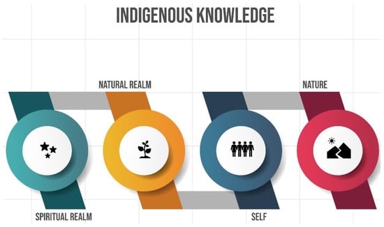 Indigenous knowledge, known as local knowledge, traditional science or traditional wisdom, is the context-specific knowledge that has helped Indigenous communities survive and thrive throughout time [17]. Academic sources recognise that Indigenous knowledge is situated within broader cultural traditions, making it empirical and local as it is orally transmitted through imitation and demonstration, generally as the consequence of practical engagement in everyday life [18]. Consequently, many practices, beliefs and values such as oral narratives, tales, songs, customs and approaches to healing and birthing, as well as death rituals, are shared by almost all Indigenous communities worldwide [19]. Another fundamental aspect of Indigenous knowledge is recognising the interrelation between the spiritual, the natural and the self [20], expressed as the interrelationship between all forms of life, the environment and the cosmos (Figure 1) [21]. The environment provides the mind, body and spirit opportunity to interconnect [22,23].