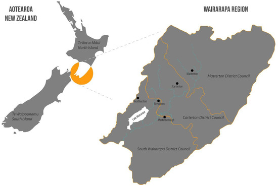 This study is situated in the Wairarapa region of Aotearoa-New Zealand’s North Island (Figure 3). Located in the south-eastern corner, northeast of the capital city of Wellington, the Wairarapa region is known for its sheep grazing and dairy farming as well as long occupation by Māori tribes, namely Ngāti Kahungunu ki Wairarapa and Rangitāne o Wairarapa. The regional population steadily increased throughout the twentieth century, reaching 41,097 individuals in 2013 [64]. The Wairarapa region has a total area of 5900 km2 (or 590,000 hectares), but the rohe (tribal boundaries) of both Rangitāne o Wairarapa and Ngāti Kahungunu ki Wairarapa extends to more than 10,000 km2 (one million hectares) to include the north-adjoining Hawke’s Bay region [64]. From the recorded population, 51.5% are females (or 21,162 individuals) and 48.5% are males (or 19,956 individuals). Looking at the population distribution, the higher proportion of people are in the younger age groups (0 to 17 years) as well as in the older age groups (50+ years), representing jointly 65% or 26,832 individuals. Concerning the major ethnic groups, 87% of the region’s population identify as of European ancestry (or Pākehā), 17.5% as Māori and a smaller proportion of people have identified as Pasifika. Although the Māori population increased by over 15% between 2006 and 2013, this ethnic group represents 7173 individuals of the Wairarapa region’s total population.