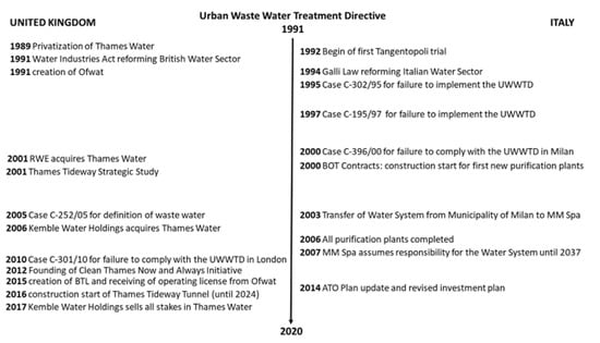 The legal case brought against Italy in 2000 for Milan’s ongoing dumping of untreated waste water into the river system, handles a similar issue, however it is larger in scale. The legal case results from previous cases against Italy for the failure to implement the UWWTD into national law and points out the immense structural changes that had to be implemented in cities across Italy (see [20,21,22]). Milan was at the time the last major European city still dumping untreated waste water. Due to these proceedings, Milan has been the subject to an infringement procedure by the EU Commission. A reason for the EU Commission’s hesitance to impose a pecuniary sanction was most likely due to the belated awarding of construction contracts to private consortia. Milan had to construct two completely new purification plants and implement major upgrades in a third between 1999 and 2006. The awarded BOT (Build–Operate–Transfer) contracts were surrounded by controversy over bribery, lack of transparency and restricted competition. These events were still very much in line with ongoing fallout from the 1990s Tangentopoli phenomena (“Bribesville”, referring to corruption in public works contracts). These scandals facilitated structural changes in the operation of Milan’s water sector, particularly with the transfer of the management responsibility for the integrated water system from the Municipality to MM Spa, a multiservice company fully owned by the Municipality of Milan. Even though the way these structural changes were implemented are still not free of criticism and path dependencies resulting from the BOT contracts are still strong, today, Milan’s water system has emerged from this transformation process with several technological and financial innovations, that set it apart from fixes such as those that were applied in London.