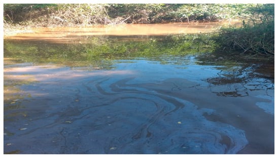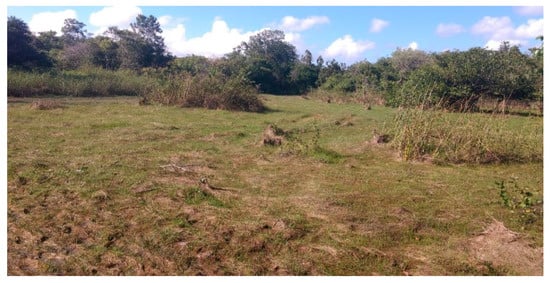The deforestation can have unpredictable systemic effects on the environment, such as the loss of animal and plant species, and at a more global level, it can generate a drastic reduction in rainfall levels []. Deforestation in the vicinity, whether for the installation of real estate projects or due to disorderly occupation, resulted in several environmental impacts, as observed during the field data collection, such as: Loss of vegetation cover; removal of the soil’s fertile layer; soil impoverishment; reduction of fauna and flora; silting of water resources, mainly.