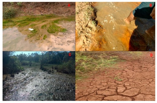 Distinct images of Lake of Juá and the effects of anthropogenic actions, Santarém, Pará, Brazilian Amazonia. (A) sewage runoff and sludge appearance, (B,C) muddy stretches, (D) compacted soil. Source: First author (2018).