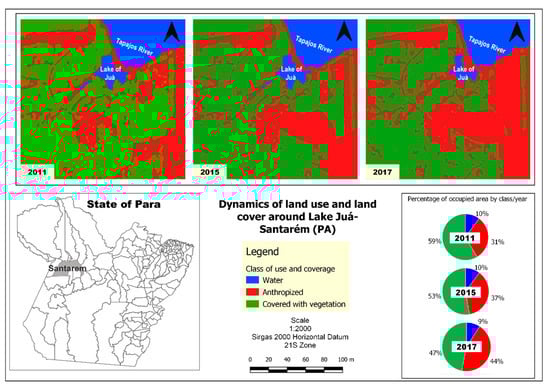 Data were analyzed using descriptive statistics, in which the relative frequency of responses given by respondents regarding the impacts they perceived was calculated []. To calculate the anthropogenic area around Lake of Juá, land use and land cover maps were generated. We used LandSat images from three periods (2011, 2015 and 2017), obtained free of charge, which were pre-processed and then supervised classified in the free software Spring version 5.2, of the National Institute for Space Research (INPE) []. The vector files generated, containing the calculation of the area occupied by each class in square kilometers, were imported into the free software Quantum Gis version 3.8, generating the thematic map of land use and coverage in the surroundings of Lake of Juá. With this information, it was possible to calculate the rate of increase in the anthropized area between 2011 and 2017, as well as obtain the gross value of each class in the same period. The study was conducted according to the guidelines of the Declaration of Helsinki and approved by the Ethics Committee of Universidade do Estado do Pará (UEPA)- Campus XII-Tapajós (protocol code 2,447,030, 2017).