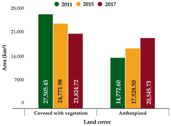 In the period between 2011 and 2017, the anthropized areas had an increase of approximately 39%, resulting, consequently, in the reduction of forest cover around the Lake (Figure 8).
