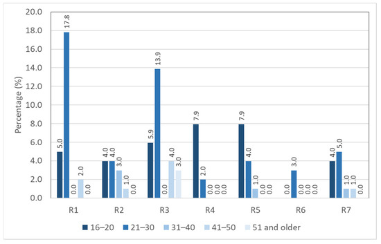 Results of crosstabulation between age groups with risky riding behavior are as shown in Figure 3. The age group of 21- to 30-year-old motorcyclists was more predominant in performing risky riding behavior “R1: crossing a stop-controlled junction without fully stopping” and “R3: did not signal when changing lane, turning, or overtaking other vehicles”, while the age group of 16–20 years old engaged more in risky riding behavior “R4: doing things that can distract you (such as using a mobile phone) while riding a motorcycle“ and “R5: not switching on the headlight during daytime”. In addition, the chi-squared test for independence showed that there was significant association between age group and risky riding behavior (χ2 = 45.399, df = 24, p = 0.005).
