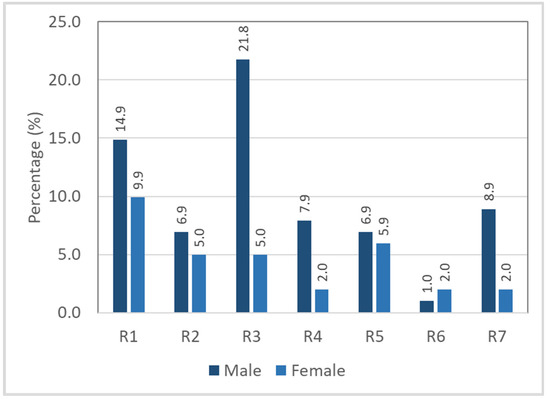 Subsequently, for the gender distribution of the respondents involved in the study, the majority of the respondents were male, with 68.32%, while the female respondents were only 31.68%. Crosstabulation results between gender with risky riding behavior are as shown in Figure 4, and the results of the chi-squared test for independence showed that gender has no significant association with risky riding behaviors (χ2 = 8.024, df = 6, p = 0.236).