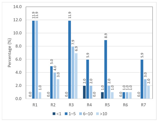 The majority of the respondents had more than 10 years (19.80%) of riding experience, while only 3.96% of respondents had less than a year of riding experience. The mean and standard deviation of driving experience were 8.0165 and 9.224 years, respectively. Results of crosstabulation between riding experience with risky riding behavior are as shown in Figure 5. Generally, participants with riding experience of between 1 and 5 years were more inclined to perform risky riding behaviors “R1: crossing a stop-controlled junction without fully stopping” and “R3: did not signal when changing lane, turning, or overtaking other vehicles”. Nevertheless, the results of the chi-squared test for independence showed that riding experience (χ2 = 26.249, df = 18, p = 0.094) had no significant association with risky riding behaviors.