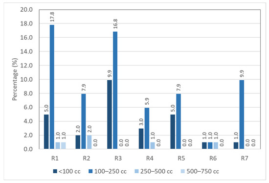 Regarding the type of owned motorcycles, most respondents owned motorcycles with engine capacity between 100 and 250 cc (67.3%), followed by 26.7% owning motorcycles of less than 100 cc, and 5% owning motorcycles between 250 and 500 cc. Only 1% or 1 respondent owned a motorcycle between 500 and 750 cc, and none of the respondents owned a motorcycle of more than 750 cc. Figure 6 shows the results of crosstabulation between motorcycle type and risky riding behavior. However, the results of the chi-squared test for independence showed that motorcycle type had no significant association with risky riding behaviors (χ2 = 20.050, df = 18, p = 0.330).