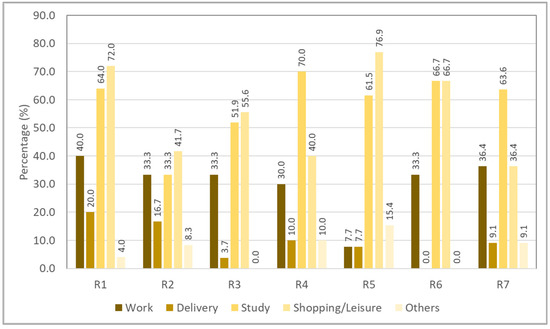 On the basis of the results of the multiple response crosstabulations plotted in Figure 7, no obvious trend could be observed. Responses on the seven types of risky riding behaviors were quite uniformly distributed across all trip purposes. Furthermore, the results of the chi-squared test for independence showed that trip purpose had no significant association with risky riding behaviors (χ2 = 27.163, df = 30, p = 0.615).
