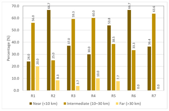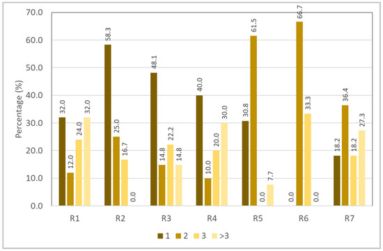 Results of crosstabulation between trip distance and risky riding behavior in Figure 9 showed no noticeable trend. However, motorcyclists travelling between 10 and 30 km generally often performed risky riding behaviors “R1: crossing a stop-controlled junction without fully stopping”, “R3: did not signal when changing lane, turning, or overtaking other vehicles”, “R4: doing things that can distract you (such as using a mobile phone) while riding a motorcycle”, and “R7: riding or performing a turn that is not according to the right-of-way rules in order to save time”. Motorcyclists travelling less than 10 km often engaged in risky riding behaviors “R2: riding motorcycle without wearing a helmet”, “R5: not switching on the headlight during daytime”, and “R6: Riding on the opposite or wrong side of road”. Nevertheless, the results of the chi-squared test for independence showed that the trip distance had no significant association with risky riding behaviors (χ2 = 13.970, df = 12, p = 0.303).