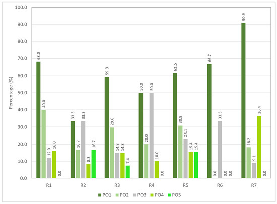 Figure 10 shows the crosstabulation of positive outcomes and risky riding behaviors. According to the results shown in Figure 10, the majority of respondents perceived “PO1: saving time” as the positive outcome in performing risky riding behaviors at unsignalized intersections, especially for risky behaviors “R1: crossing a stop-controlled junction without fully stopping” (68.0%), “R3: did not signal when changing lane, turning, or overtaking other vehicles” (59.3%), “R5: not switching on the headlight during daytime” (61.5%), “R6: riding on the opposite or wrong side of road” (66.7%), and “R7: riding or performing a turn that is not according to the right-of-way rules in order to save time” (90.9%).
