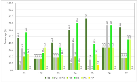 Figure 12 shows the crosstabulation between positive influence and risky riding behavior. Results indicated that “PI1: parents” and “PI5: friends” generally recorded higher percentage as compared to that of other positive influences, especially in performing risky riding behaviors “R1: crossing a stop-controlled junction without fully stopping” (48.0% and 56.0%, respectively), “R3: did not signal when changing lane, turning, or overtaking other vehicles” (40.7% and 33.3% respectively), “R4: doing things that can distract you (such as using a mobile phone) while riding a motorcycle” (60.0% and 70.0%, respectively), “R5: not switching on the headlight during daytime” (76.9% and 38.5%, respectively), and “R7: riding or performing a turn that is not according to the right-of-way rules in order to save time” (63.6% and 45.4% respectively). For risky riding behavior “R2: riding motorcycle without wearing a helmet”, the highest recorded percentage was for “PI6: other road users” with 33.3%. For risky riding behavior “R6: riding on the opposite or wrong side of road”, the more significant positive influences were “PI3: police” and “PI5: friends” with the same percentage of 66.6%. Nevertheless, the chi-squared test for independence showed no significant association between positive influences with risky riding behavior (χ2 = 45.610, df = 42, p = 0.324).
