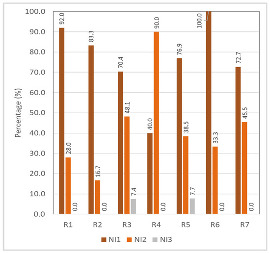 The results of crosstabulation between negative influences and risky riding behavior are as shown in Figure 13. Generally, results demonstrated that “NI1: other road users” was the more critical negative influence for all risky riding behaviors except for “R4: doing things that can distract you (such as using a mobile phone) while riding a motorcycle”, which recorded higher percentage for negative influence “NI2: friends (peer pressure)” with 90.0%, as compared with only 40.0% recorded for “N1: other road users”. Additionally, the most critical risky riding behavior for negative influence “NI1: other road users” was “R6: riding on the opposite or wrong side of road” (100.0%), followed by “R1: crossing a stop-controlled junction without fully stopping” (92.0%), “R2: riding a motorcycle without wearing a helmet” (83.3%), “R5: not switching on the headlight during daytime” (76.9%), “R7: riding or performing a turn that is not according to the right-of-way rules in order to save time” (72.7%), and “R3: did not signal when changing lane, turning, or overtaking other vehicles” (70.4%). The chi-squared test for independence showed that there was a significant association between negative influences with risky riding behavior (χ2 = 32.554, df = 18, p = 0.019). Therefore, results indicated that, between positive and negative influences, negative influences more significantly impact risky riding behavior.