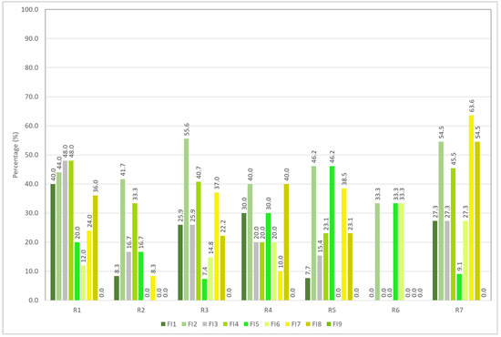 For the inhibiting factors of risky riding behavior shown in Figure 14, “FI2: when there is a police or camera nearby” generally recorded a higher occurrence rate for all risky behaviors, while “FI7: when thinking of loved ones” recorded the highest percentage for risky behavior “R7: riding or performing a turn that is not according to the right-of-way rules in order to save time” with a 63.6% occurrence rate. Lastly, “FI6: riding or performing a turn that is not according to the right-of-way rules in order to save time” was the least significant factor in discouraging risky riding behavior with an average occurrence rate of only 15.3% across all risky riding behaviors. The chi-squared test for independence also showed that there was a significant association between inhibiting factors and risky riding behavior (χ2 = 66.889, df = 48, p = 0.037).
