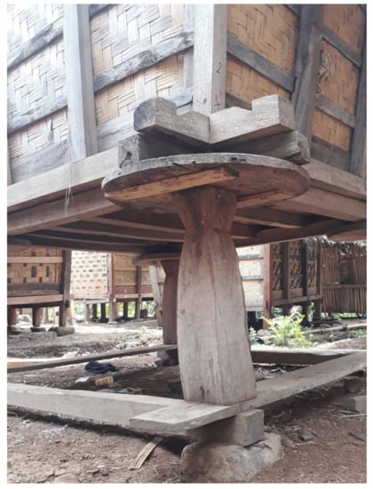 Huma rice preservation plays a pivotal role in the lives of Baduy communities as it not only guarantees their autonomy and their food security but also represents their insurance against shortages due to adverse weather conditions, health hazards and natural disasters. Before storing the rice harvest, the Baduy allow it to dry by tying it in bunches (ears with stalks) and hanging them on a long bamboo pole. Dried bunches are then kept in small bamboo-walled barns called leuit, made only from wooden materials. The Baduy build these barns on stilts with a mechanism to protect the stored harvest from rats and other rodents. The rat protection mechanism is made of wooden discs called geuleubeug, which are placed on top of the leuit stilts to make it physically impossible for rodents to reach the inside of the barns. These wooden discs are large enough that the rats have no possible way of climbing past the leuit leg. They may attempt to crawl horizontally on the downside, but that side is made very slippery so that no rat can crawl upside-down and reach the edge (see Figure 2). That way, rats are kept at bay without incurring any risk of being killed. The so-preserved rice can remain unattended for a long time, which can reach 50 to over 90 years (Rice barn harvest can even be inherited from one generation to the next [63]).