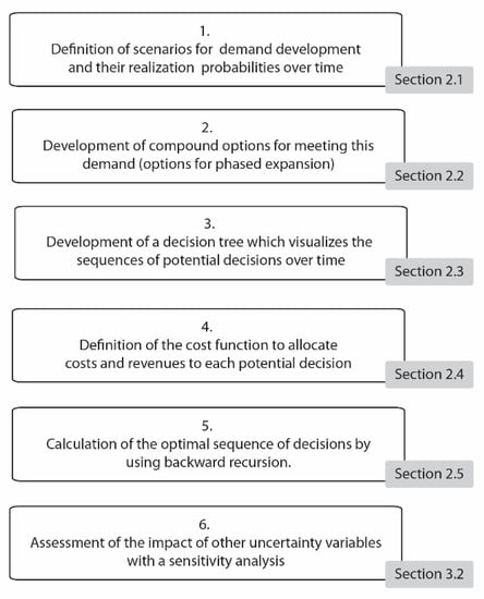 - Development of a decision tree which visualizes the sequences of potential decisions over time. All sequential options (potential decisions) for capacity expansion have been modelled in a decision tree. Constructing a decision tree follows a generic process where decision nodes represent points in time where decisions can be taken, and arrows departing from these nodes represent the potential decisions. This is elaborated on in Section 2.3.
