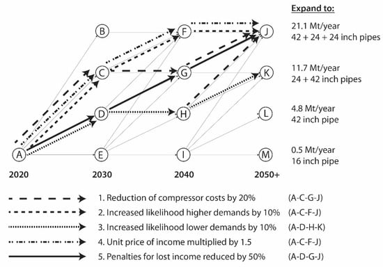 The sensitivity analysis may result in confusion because new optimal paths emerge. A decision maker is most interested in the first optimal decision. The decision maker has to weigh the likelihood of the sensitivity scenarios. A reduction of compressor costs in the short term of 20% is not very likely. The scenarios for demand development, as depicted in Table 1, are constructed based on current best expectations, and there is no reason to deviate from them in the short term. The penalties for lost income were chosen with care and are currently considered a reasonable estimate for risk costs. Finally, the unit price is considered. The levelized unit cost for break-even was calculated at 0.42 EUR/kg/1000 km. If the price for transportation would be increased by a factor 1.5 to 0.63 EUR/kg/1000 km, immediate expansion to 11.7 Mt/y would be induced. However, increasing the price may also lower future demand. A decision maker needs to weigh the options. These answers cannot be given by the ROA model or the current research because, here, research into business development is required. However, the ROA model supports asking the right questions and demonstrates the consequences of expectations and potential decisions. It is a tool to support decision making. The decision maker may want to construct some combined sensitivity scenarios. An ROA model supports a quick calculation of numerous sensitivity scenarios and helps the decision maker to evaluate the optimal path from a broader perspective.